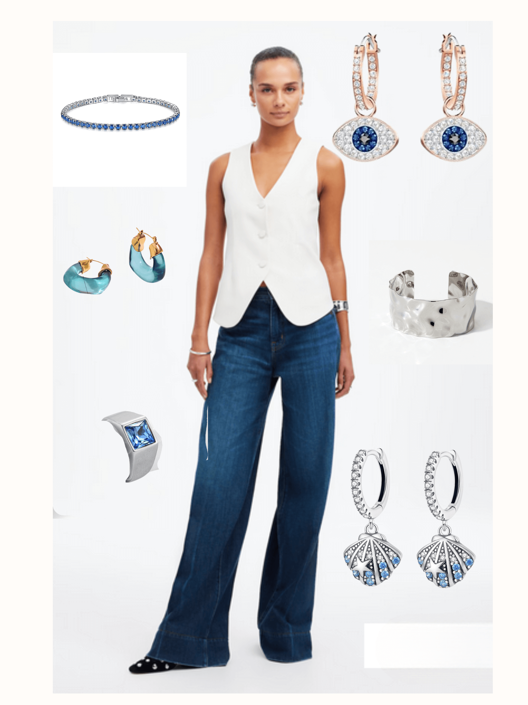 En mi lista de accesorios agregaré aretes de piedras pequeñas, con pulseras relacionadas a la frescura del mar, el azul es el color del mes, créeme que la mezclilla en es lo que más salía en las vitrinas, los mismos de año pasado funcionan con algunas blusas de tirantes para llevar una chaqueta encima por si refresca.
